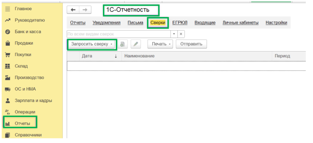 Для этого перейдите на вкладку «Отчеты» -> «1С-Отчетность» откройте подраздел «Сверки» и нажмите кнопку «Запросить сверку».