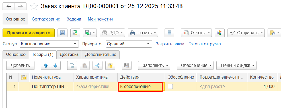 После внесения предоплаты или полной оплаты, действие у товара меняется на К обеспечению, что означает, что товар зарезервирован и его можно готовить к отгрузке.