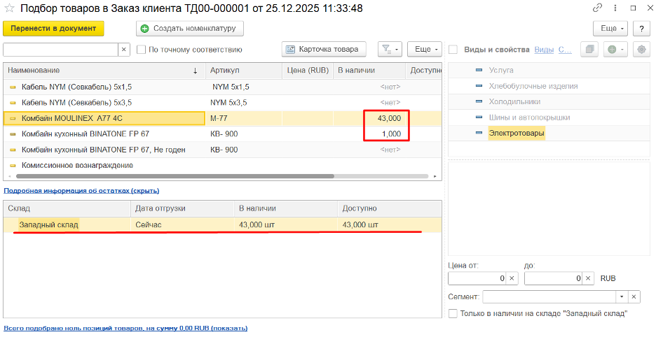 Через форму подбора товаров можно видеть какие товары, в каком количестве и на каком складе есть.Если заказ оформлен на группу складов, то в форме ввода количества на закладке В наличии – колонка Доступно можно получить информацию о свободных остатках товаров на всех складах, входящих в группу склада: