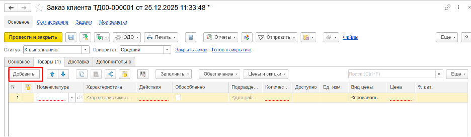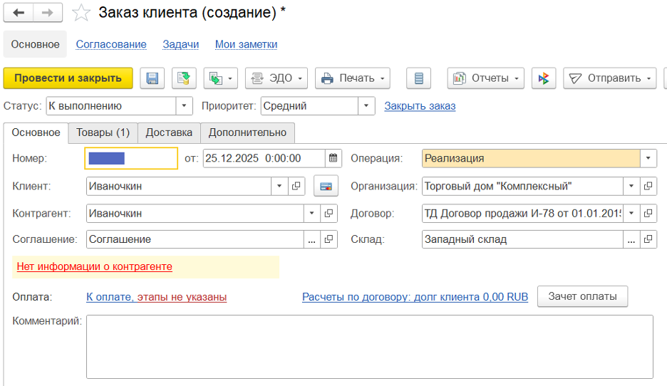 Создаем заказ клиента, заполняем поля Клиент, Соглашение, Договор (при наличии) и Склад: