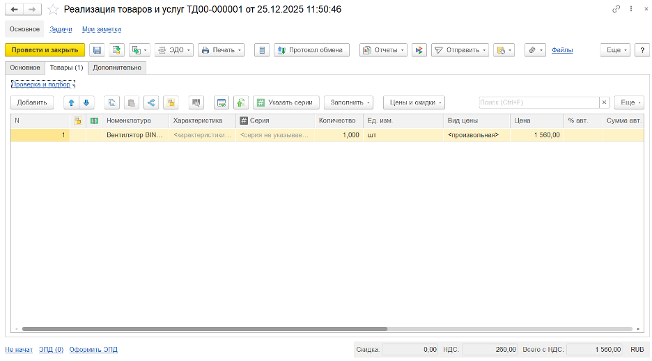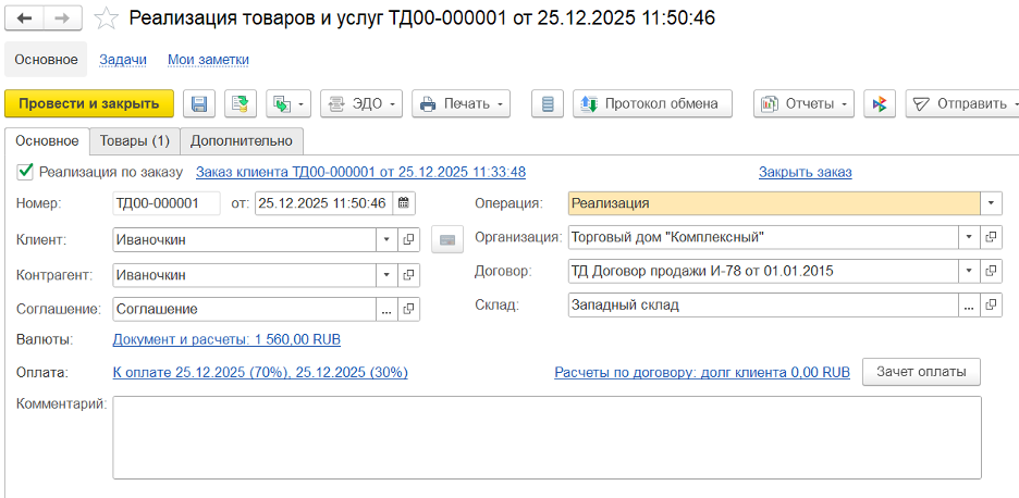 После того, как товар готов к отгрузке, меняем действие на Отгрузить и создаем документ Реализация товаров и услуг, который будет заполнен автоматически из заказа клиента: