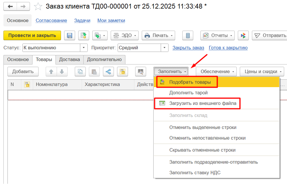 Нажав кнопку «Заполнить», можно подобрать товары, используя форму подбора номенклатуры, а также загрузить из внешнего файла: