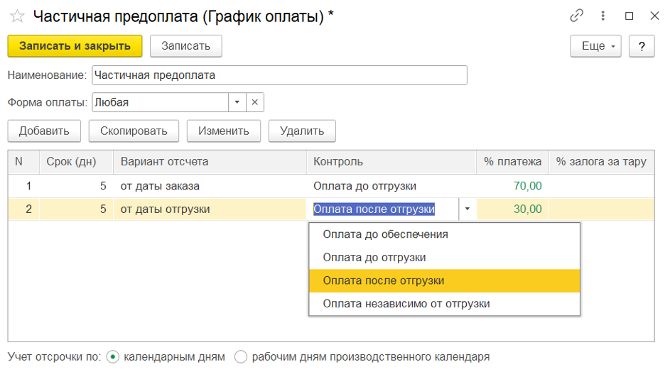 В Соглашении можно задать условия оплаты. Пользователь может указать конкретную форму оплаты (наличная или безналичная), количество дней на оплату заказа, вариант отсчета дней (от даты заказа, согласования, отгрузки и т.д.), зафиксировать дату платежа, процент или сумму оплаты.: