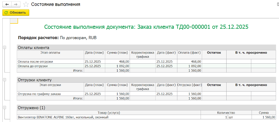 Заказ закрыт. Система считывает все документы по заказу и формирует его состояние в данном отчете: