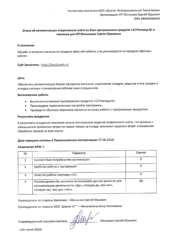 Автоматизация оперативного учета в магазине кресел для дома и офиса