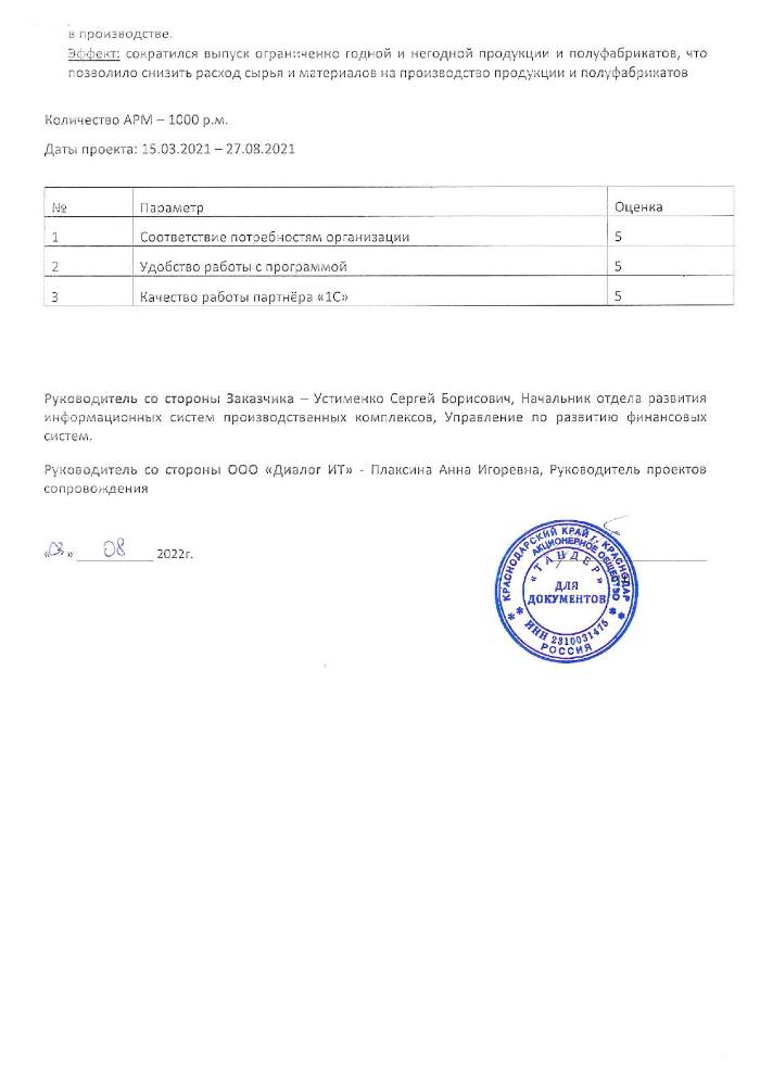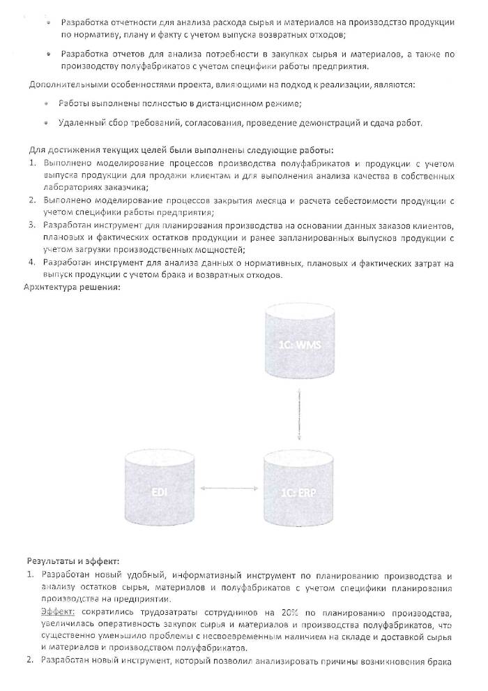 Эффект: на 20% сократились трудозатраты сотрудников на планирование производства, увеличилась оперативность закупок сырья и материалов и производства полуфабрикатов, что существенно уменьшило проблемы с несвоевременным наличием на складе и доставкой сырья и материалов и производством полуфабрикатов.