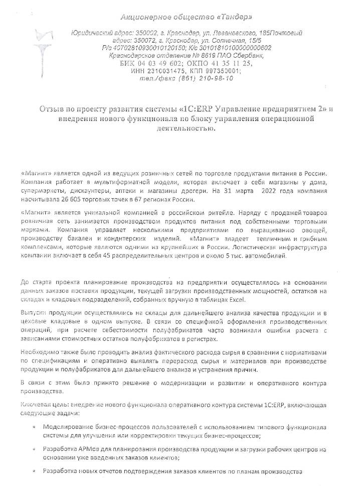 Внедрение блока управления операционной деятельностью производства и финансами на базе 1С:ERP