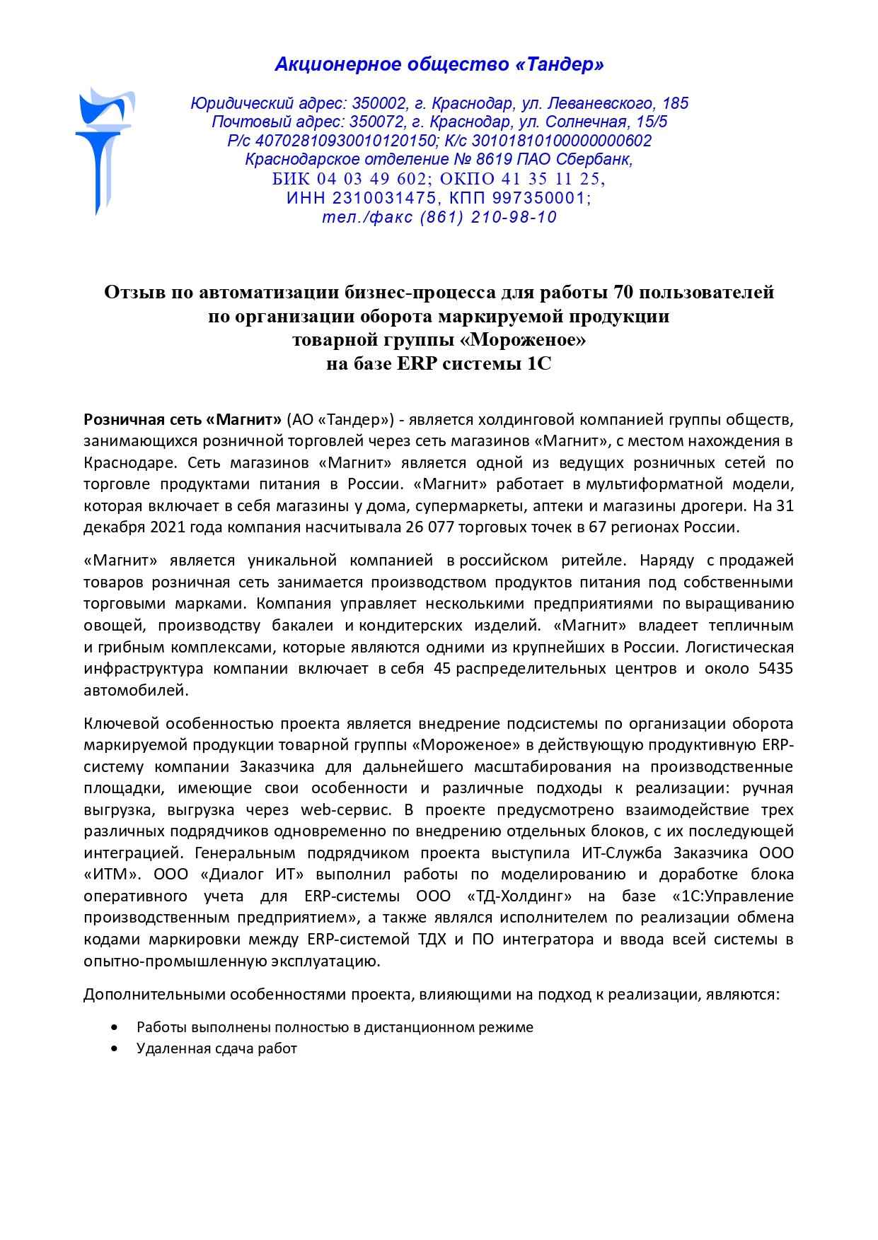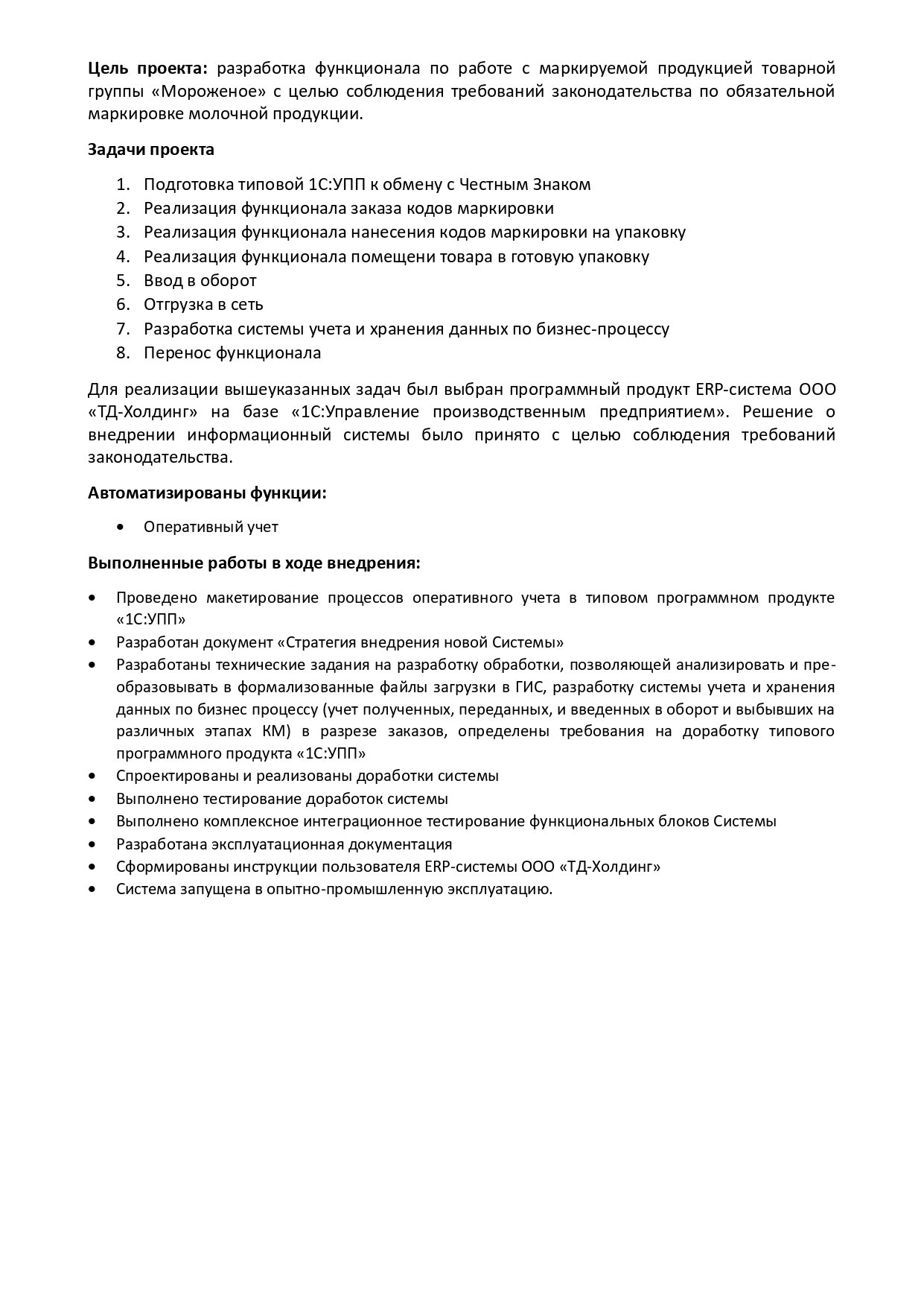 Ключевой особенностью проекта является внедрение подсистемы по организации оборота маркируемой продукции товарной группы «Мороженое» в действующую продуктивную ERP-систему компании Заказчика для дальнейшего масштабирования на производственные площадки, имеющие свои особенности и различные подходы к реализации: ручная выгрузка, выгрузка через web-сервис. В проекте предусмотрено взаимодействие трех различных подрядчиков одновременно по внедрению отдельных блоков, с их последующей интеграцией. Генеральным подрядчиком проекта выступила ИТ-Служба Заказчика ООО «ИТМ». ООО «Диалог ИТ» выполнил работы по моделированию и доработке блока оперативного учета для ERP-системы ООО «ТД-Холдинг» на базе «1С:Управление производственным предприятием», а также являлся исполнителем по реализации обмена кодами маркировки между ERP-системой ТДХ и ПО интегратора и ввода всей системы в опытно-промышленную эксплуатацию.