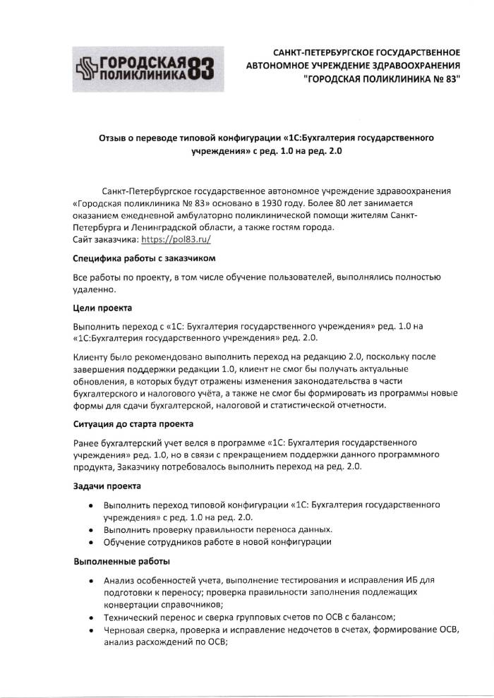 Ранее бухгалтерский учет велся в программе «1С: Бухгалтерия государственного учреждения» ред. 1.0, но в связи с прекращением поддержки данного программного продукта, Заказчику потребовалось выполнить переход на ред. 2.0.